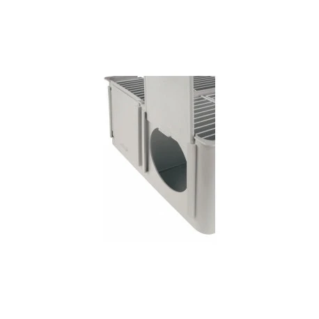 Cage de transport avec intérieur amovible et mangeoires extérieures.
