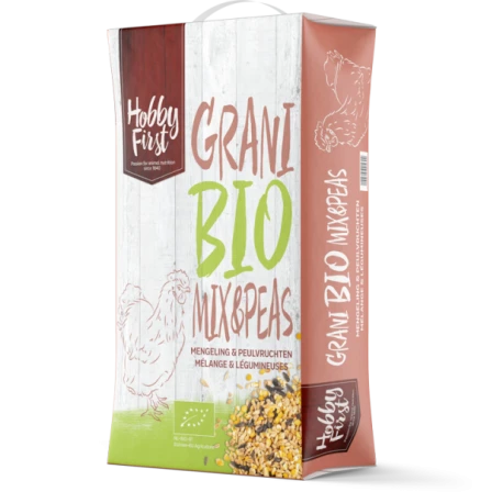 Grani Bio Mix & Peas est composé de graines et de grains issus de la culture biologique (sans utilisation de pesticides chimiques et sans engrais artificiel) et est 100% végétal. Grani Bio Mix & Peas est un mélange varié de maïs concassé et de diverses autres céréales et graines, mais sans soja ni pellets. L’ajout de pois et de lupins augmente la teneur en protéines de manière tout à fait naturelle et stimule ainsi la ponte.